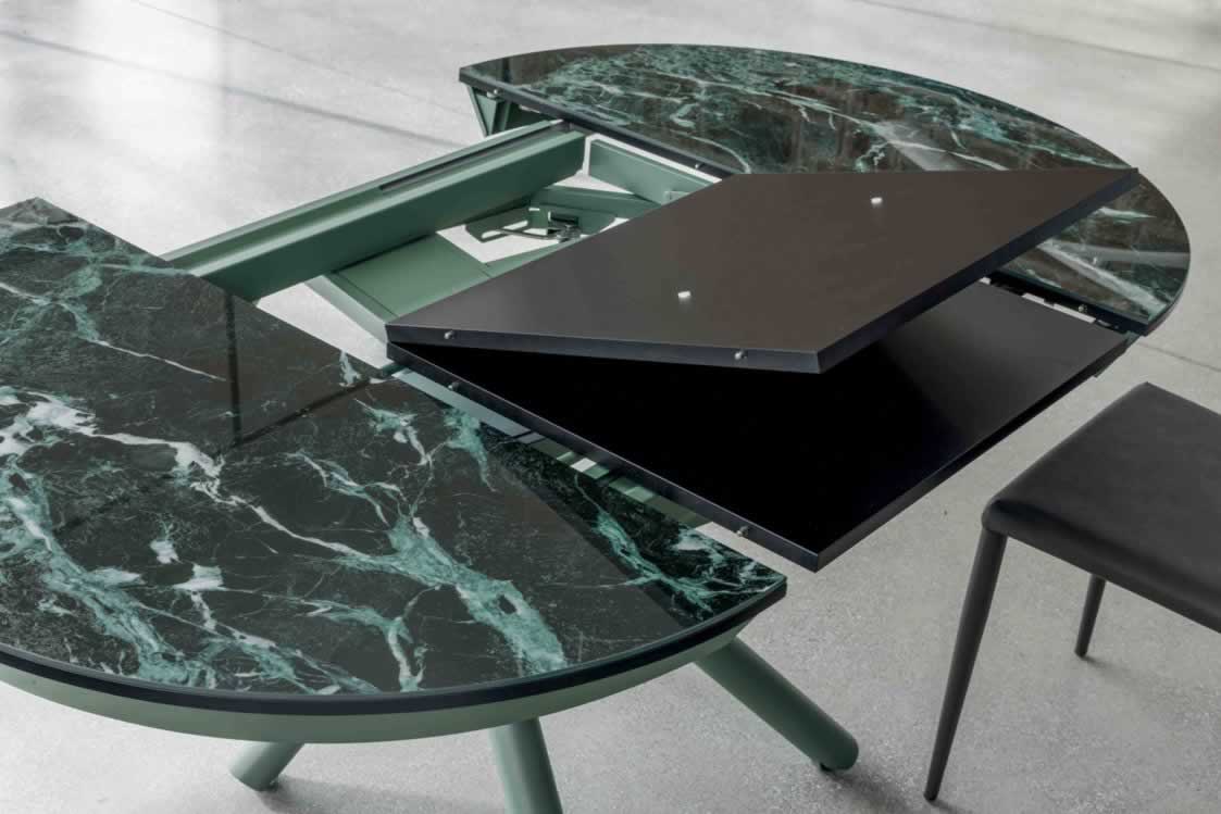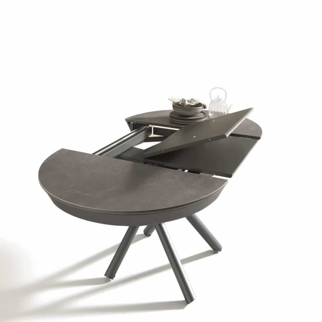 Le dimensioni del tavolino HELIOS sono diametro 105 cm da chiuso e 165×105 cm da aperto, con altezza regolabile al millimetro da 36 a 75 cm per adattarsi facilmente a ogni esigenza d’uso.