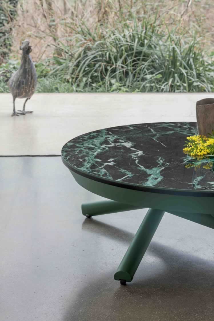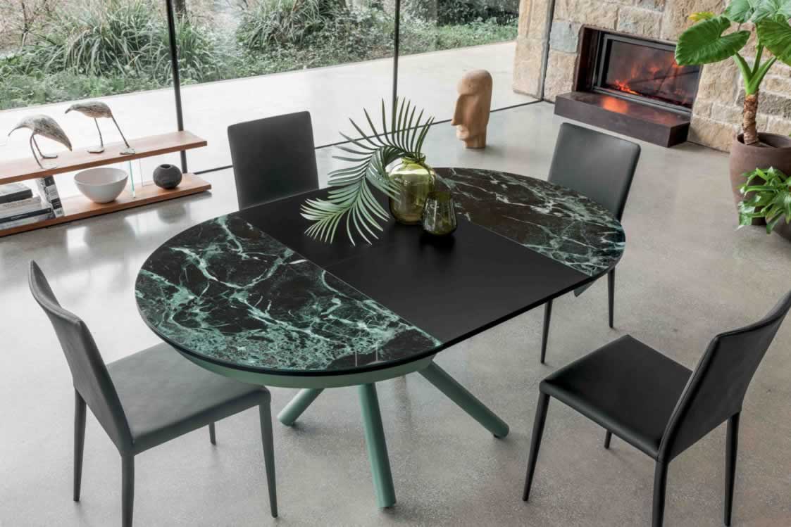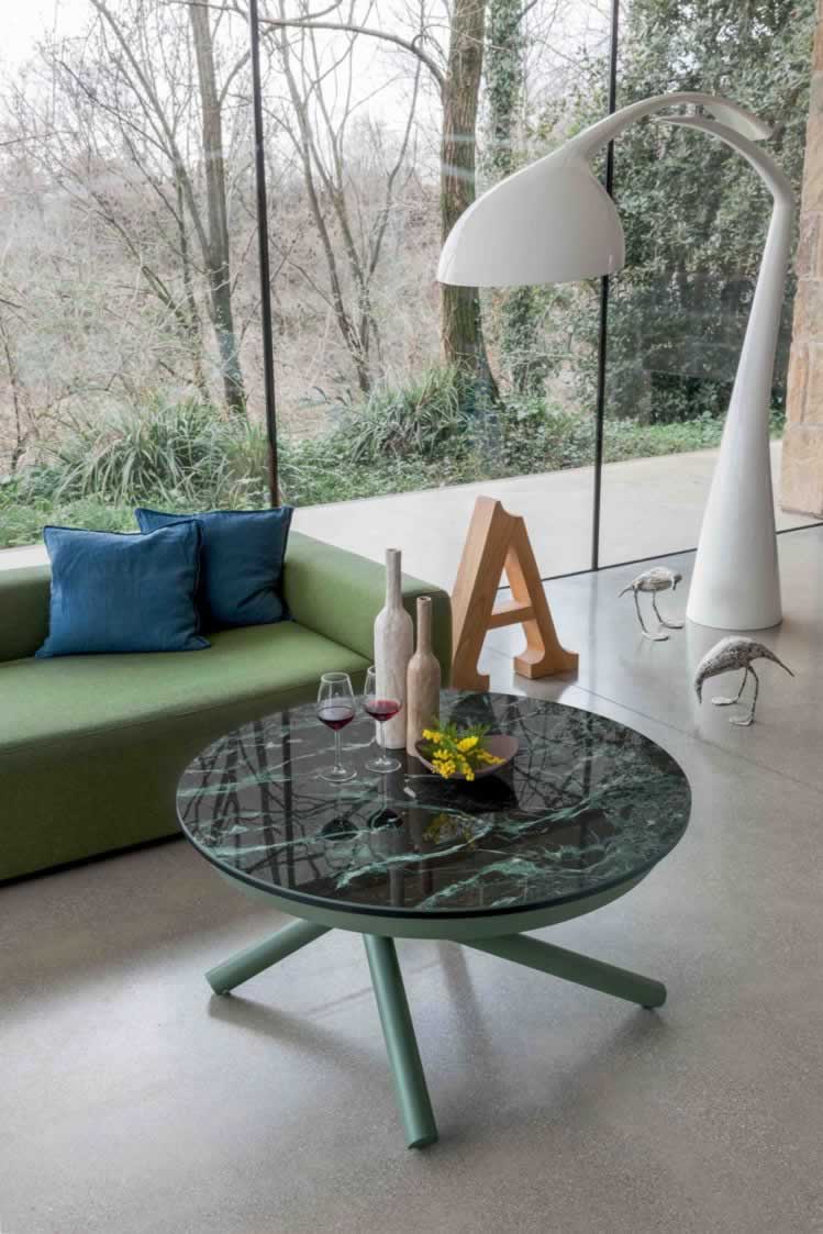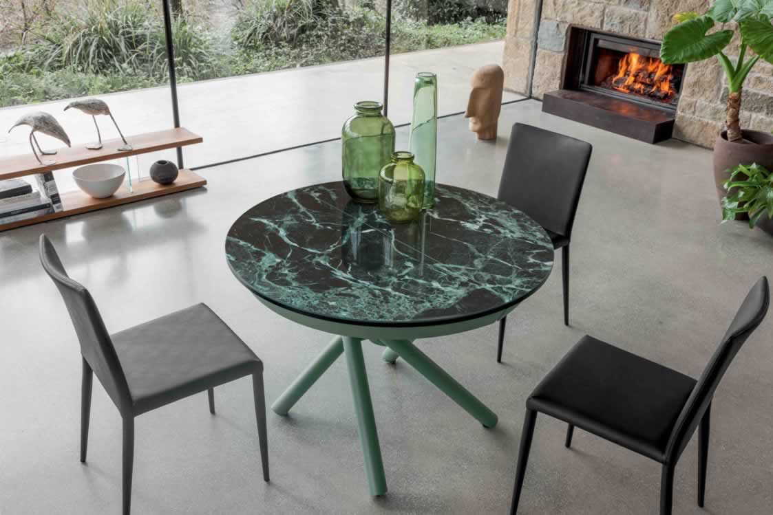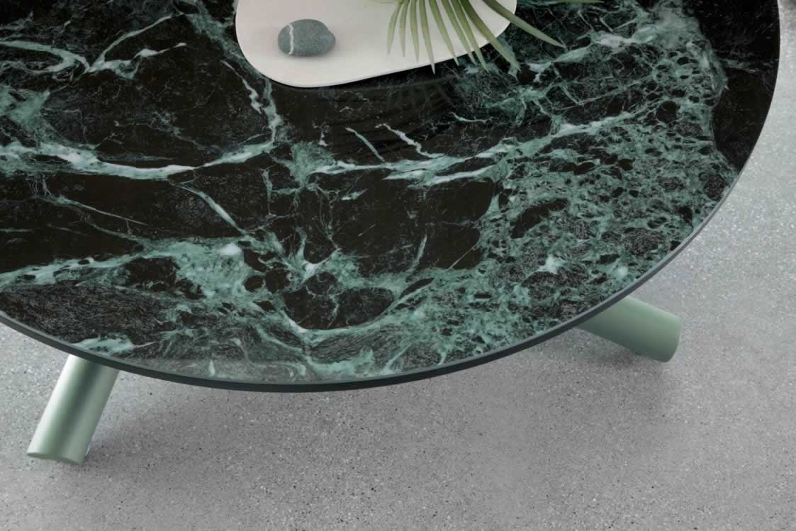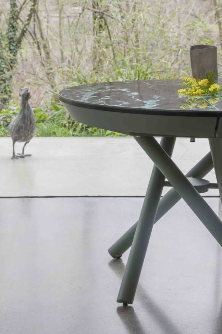Il piano è disponibile in diverse finiture di vetro o ceramica, perfette per valorizzare ambienti moderni e raffinati, mentre le gambe in metallo verniciato, disponibili in vari colori, completano il look con uno stile elegante e minimale.
