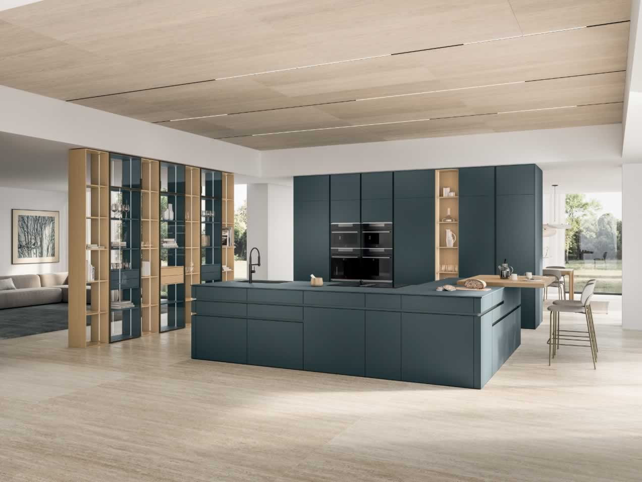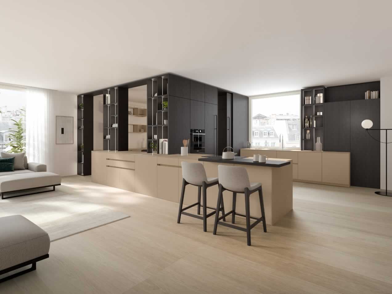 Iconica di Veneta Cucine propone una nuova visione estetica e la rottura degli schemi compositivi classici attraverso l’assenza del profilo superiore sulle basi e l’utilizzo di un sistema di allineamenti che supera il tradizionale modo di pensare il progetto.